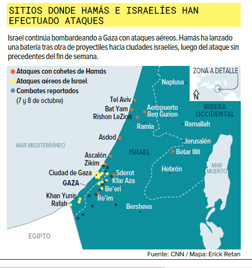 La agresión por tierra, mar y aire que realizó el grupo palestino dejó más de mil 200 muertos en Israel, entre ellos 169 soldados, según el ejército, así como cientos de civiles masacrados por los islamistas en los kibutz y en un festival musical. Decenas de personas están desaparecidas o como rehenes de Hamás, entre ellas dos mexicanos.