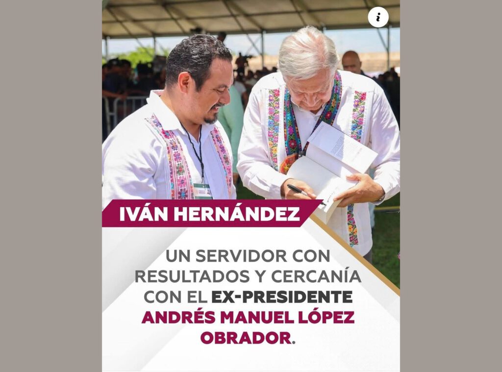 Otra publicación muestra a Hernández Díaz junto al entonces presidente Andrés Manuel López Obrador, con el texto: “Iván Hernández un servidor con resultados y cercanía con el expresidente Andrés Manuel López Obrador”.