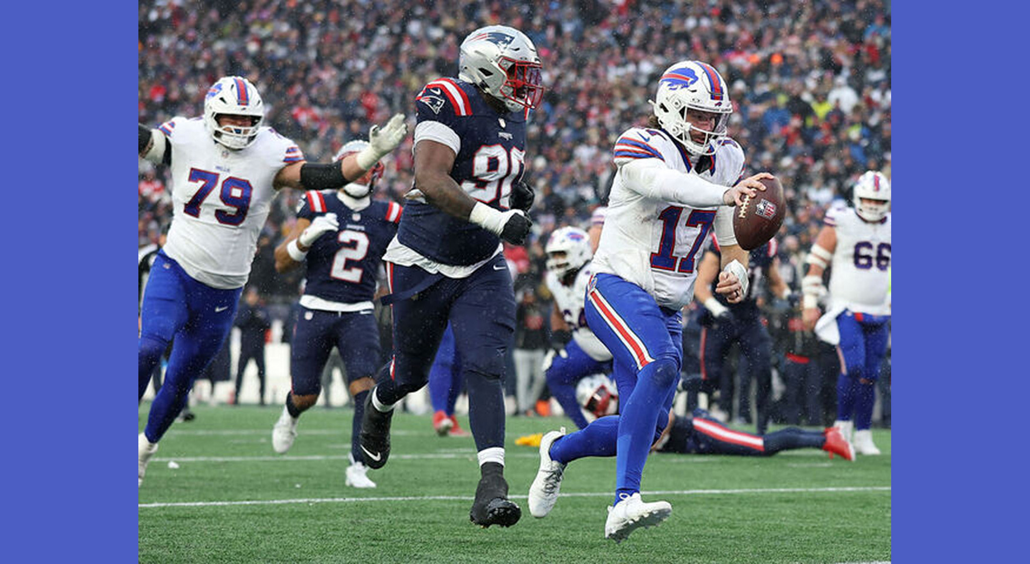 Estados Unidos., Josh Allen fue al gélido campo de Foxboro a dejar helados a los aficionados de los New England Patriots, que vieron con temperaturas bajo cero cómo su equipo dejó su paso invicto después de 10 partidos en la NFL, gracias a una gran reacción de Bills que se llevó la victoria 35-31.