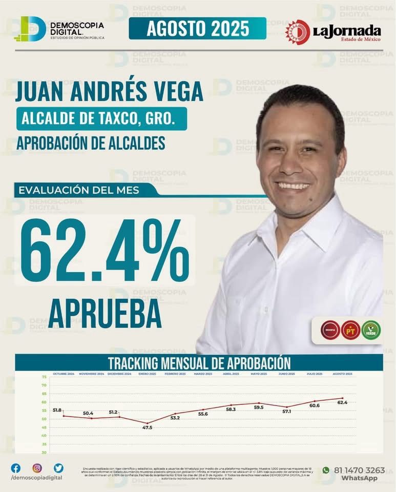 “Amigas y amigos, estoy profundamente emocionado y agradecido con cada una y cada uno de ustedes. Hoy, gracias a la confianza ciudadana, Taxco se coloca en el primer lugar de aprobación en Guerrero, con un 62.4% de respaldo”, señaló.
