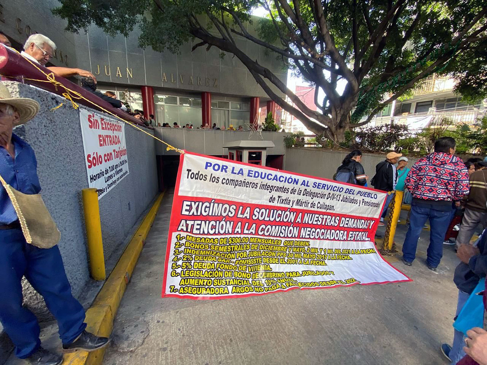 Los integrantes de la Delegación sindical D-IV-(13), correspondiente a los municipios de Tixtla y Mártir de Cuilapan (Apango), así como otras delegaciones de esta región Centro, llegaron antes de las 09:00 horas y protestaron afuera del inmueble, sobre la calle 16 de septiembre.