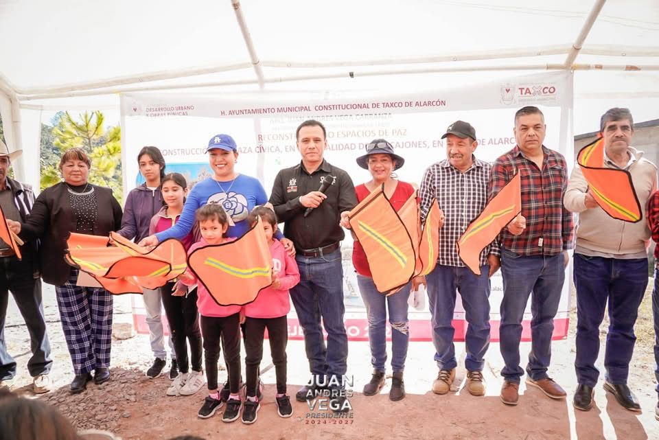 Taxco, Guerrero, Noviembre 18.- El gobierno de Taxco, encabezado por el Arq. Juan Andrés Vega Carranza, puso en marcha la construcción de la nueva Plaza Cívica en la comunidad de Cajones. El edil informó que este importante proyecto es posible gracias al programa Reconstruyendo Espacios de Paz, que busca dignificar los entornos y fortalecer la convivencia comunitaria.