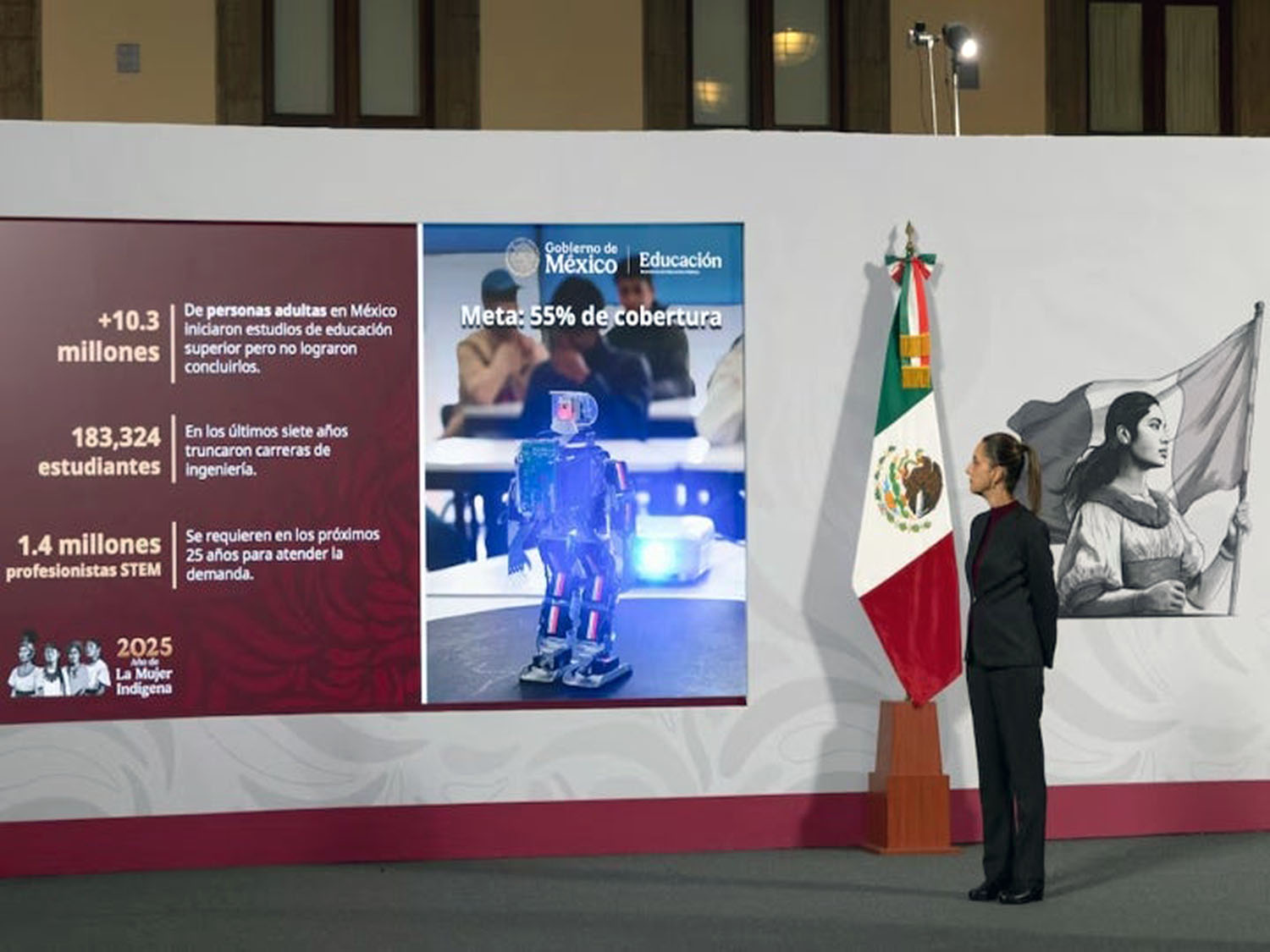 En su intervención, el secretario de Educación Pública, Mario Delgado Carrillo, explicó que, se estima llegar, potencialmente, a 10.3 millones de personas que no concluyeron su educación superior, así como 183 mil 324 ingenieros con carrera trunca. Lo que se suma a la meta de cobertura de 55 por ciento de espacios físicos en la educación superior.