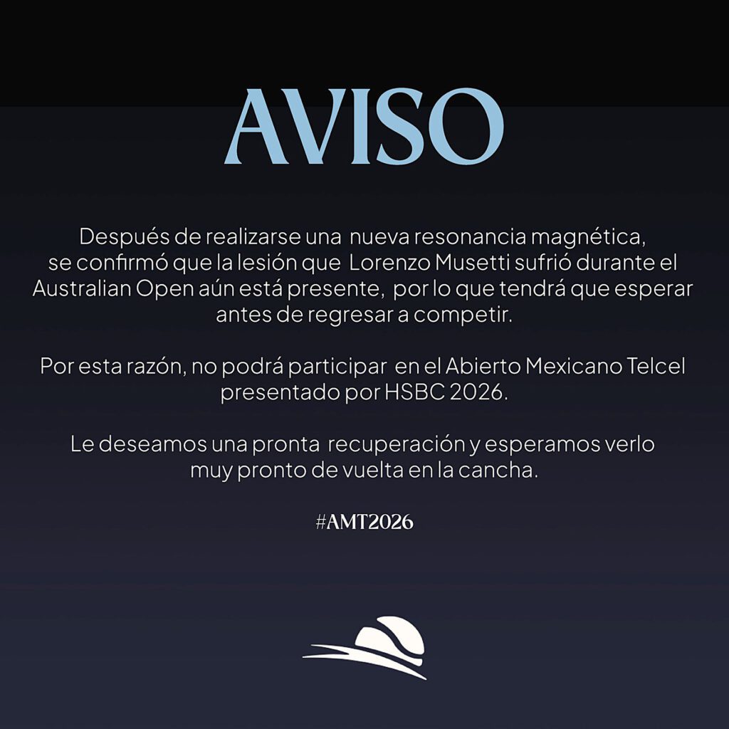 Acapulco, Gro., Una vez más, el tenista Lorenzo Musetti no estará presente en el Abierto Mexicano de Tenis, luego de que la organización anunció su baja para la edición 2026, dejando así fuera al actual número cinco del ranking ATP; esto como consecuencia de una lesión que acarrea desde el inicio de la temporada.