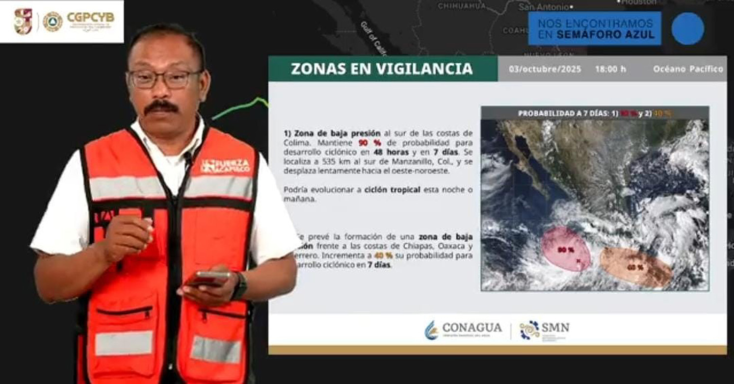 De acuerdo con la Comisión Nacional del Agua (Conagua), el primer sistema presenta 90 por ciento de probabilidad de evolucionar a ciclón tropical y se localiza a 535 kilómetros al sur de Manzanillo, Colima, mientras que el segundo registra un 40 por ciento de probabilidad de desarrollo ciclónico frente al Golfo de Tehuantepec.