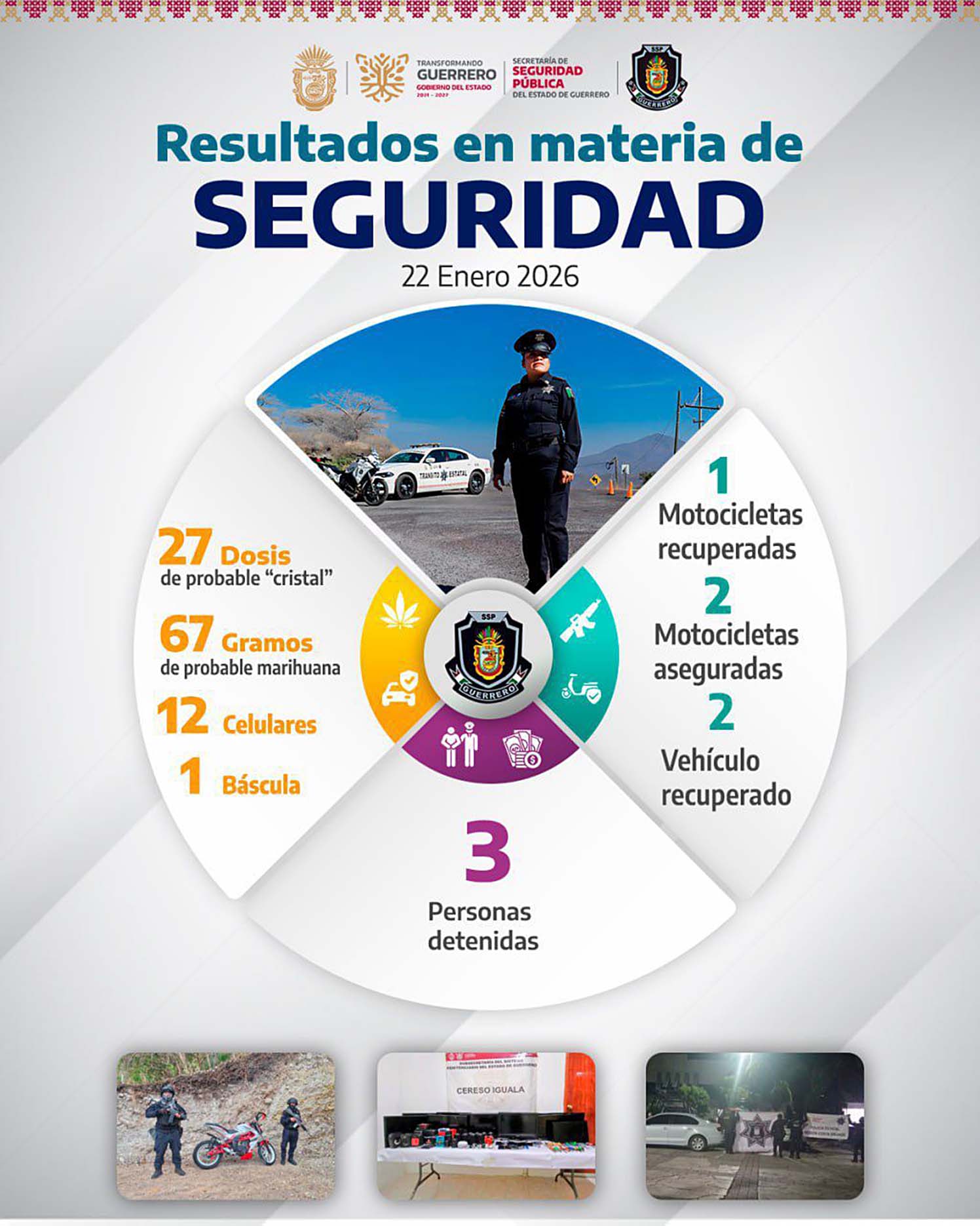 De acuerdo con el reporte correspondiente al jueves 22 de enero de 2026, derivado de estos operativos se logró la recuperación de tres motocicletas y dos vehículos con reporte de robo, así como la detención de tres personas, quienes fueron puestas a disposición de las autoridades competentes.