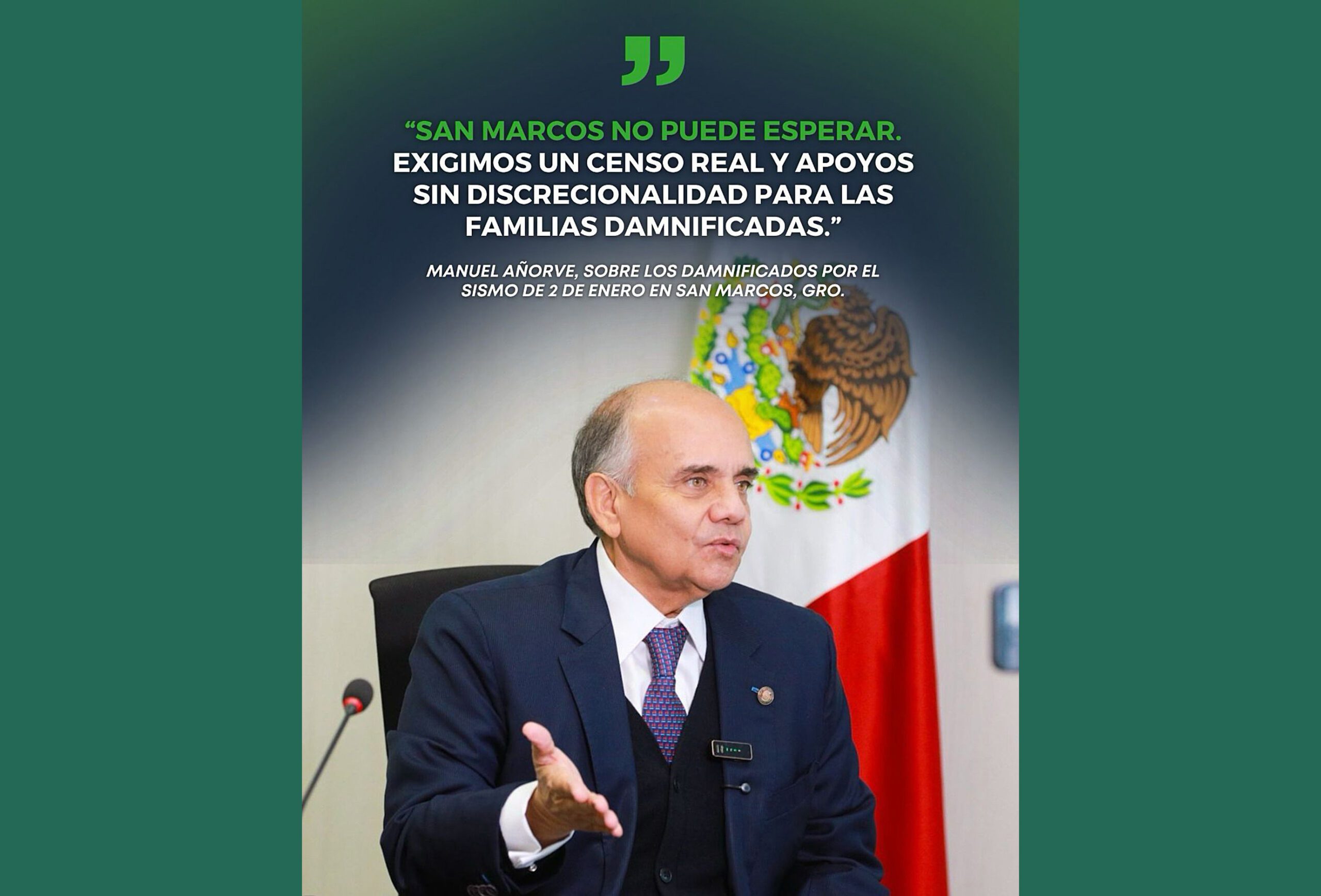 San Marcos, Gro., Ante las graves afectaciones que persisten en el municipio de San Marcos tras el sismo de magnitud 6.5 registrado el pasado 2 de enero, el senador Manuel Añorve Baños exigió desde el Senado de la República la atención inmediata de las autoridades federales y estatales.