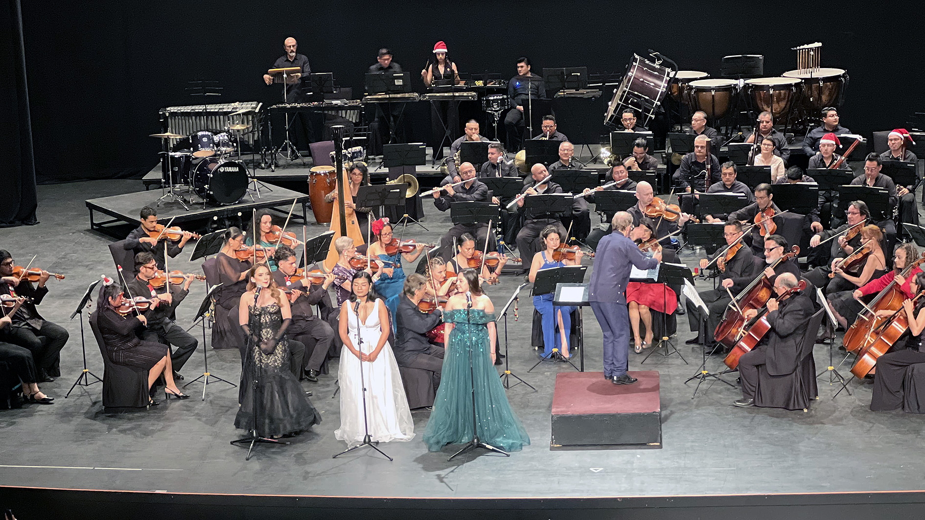 En el escenario lució el talento de las sopranos, Lexley Lara y Elizabeth Juárez, así como la cantante Ximena Ocampo, quienes fueron las solistas invitadas en este concierto, interpretando de manera emotiva los famosos temas navideños: “Winter Wonderland” (F. Bernard/Richard B. Smith); “Una rosa ha brotado” (M. Praetorius); “Panis Angelicus” (C.Frank); “All I Want for Christmas is you” (arr. F. Bernaerts); “Blanca Navidad” ( I. Berlín) y “Noche de Paz” (F. X. Gruber).