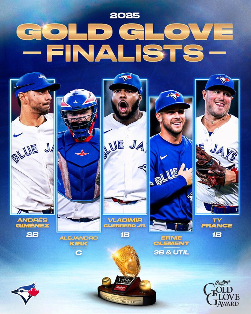 El anuncio de Rawlings Baseball colocó a cinco jugadores de Toronto entre los finalistas, una cifra que sólo los Cubs superan. A la nominación de Kirk se suman las de Vladimir Guerrero Jr. en primera base, Ty France en la misma posición, Andrés Giménez en segunda y Ernie Clement en tercera y en la categoría de utility. Clement podría hacer historia si gana en ambas, algo inédito desde que se entrega el premio.