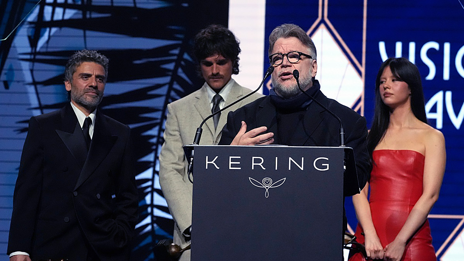 Guillermo del Toro, de 61 años, subió al escenario de los Palm Springs Film Awards, sin pasar por la alfombra roja, acompañado por los protagonistas de su película Frankenstein, Oscar Isaac, Jacob Elordi y Mia Goth.