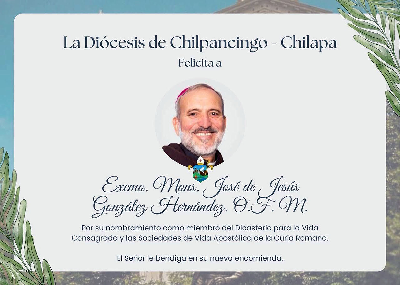 Iguala, Gro., Mediante un comunicado, la Diócesis de Chilpancingo-Chilapa confirmó el nombramiento del obispo José de Jesús González Hernández como miembro del Dicasterio para la Vida Consagrada y las Sociedades de Vida Apostólica del Vaticano, designación realizada por el Papa León XIV.