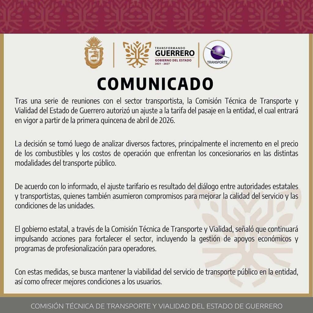 Chilpancingo, Gro., La Comisión Técnica de Transporte y Vialidad del Estado de Guerrero hizo oficial el incremento a las tarifas del transporte público en todas sus modalidades en la entidad, medida que entrará en vigor durante la primera quincena de abril de 2026, sin embargo, no dio a conocer el porcentaje del ajuste.