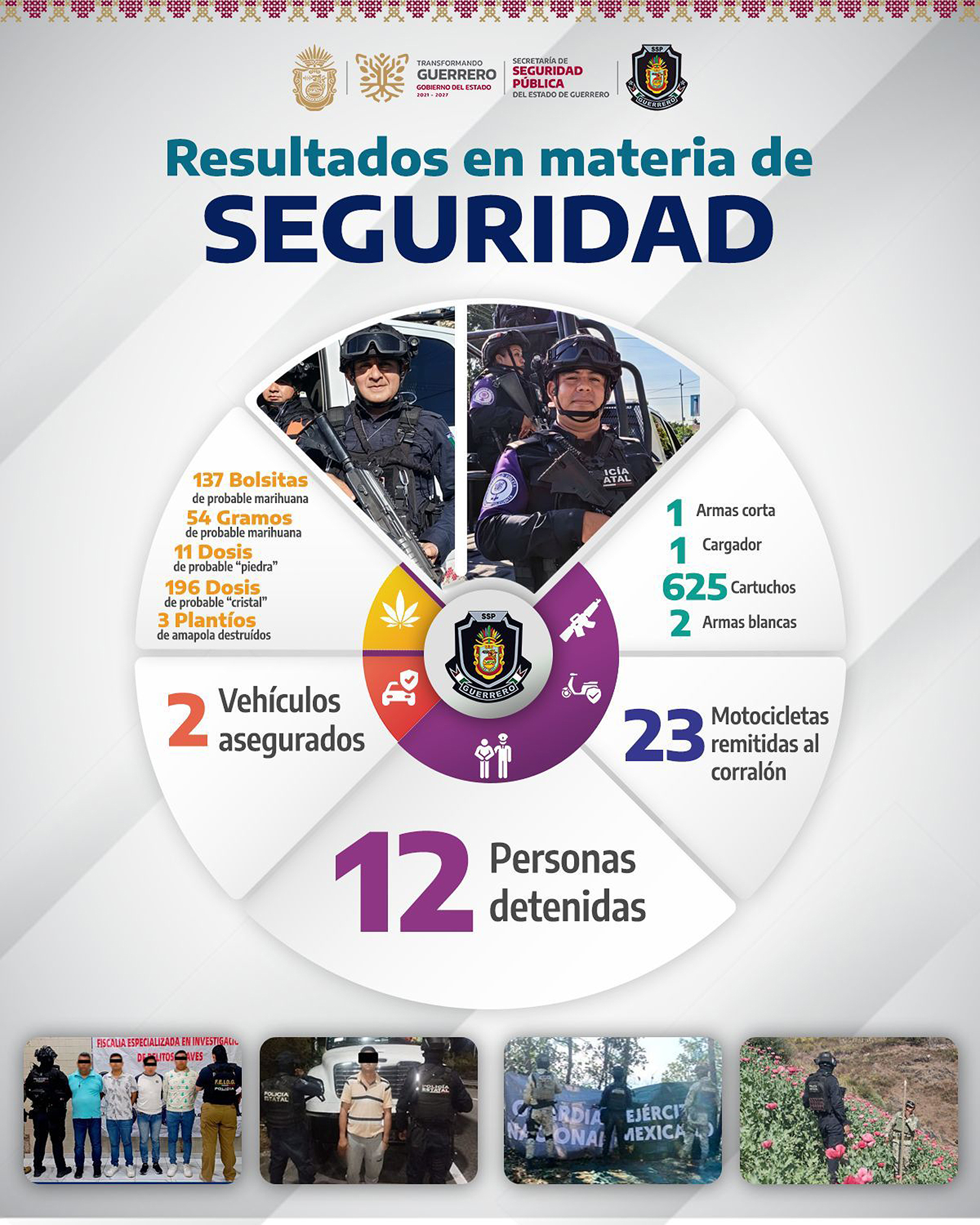 Chilpancingo, Gro., Derivado de los operativos interinstitucionales realizados en distintas regiones del estado, la Secretaría de Seguridad Pública de Guerrero, en coordinación con el Ejército Mexicano, la Guardia Nacional, la Secretaría de Seguridad y Protección Ciudadana y la Fiscalía General del Estado, obtuvo importantes resultados durante las últimas 24 horas.