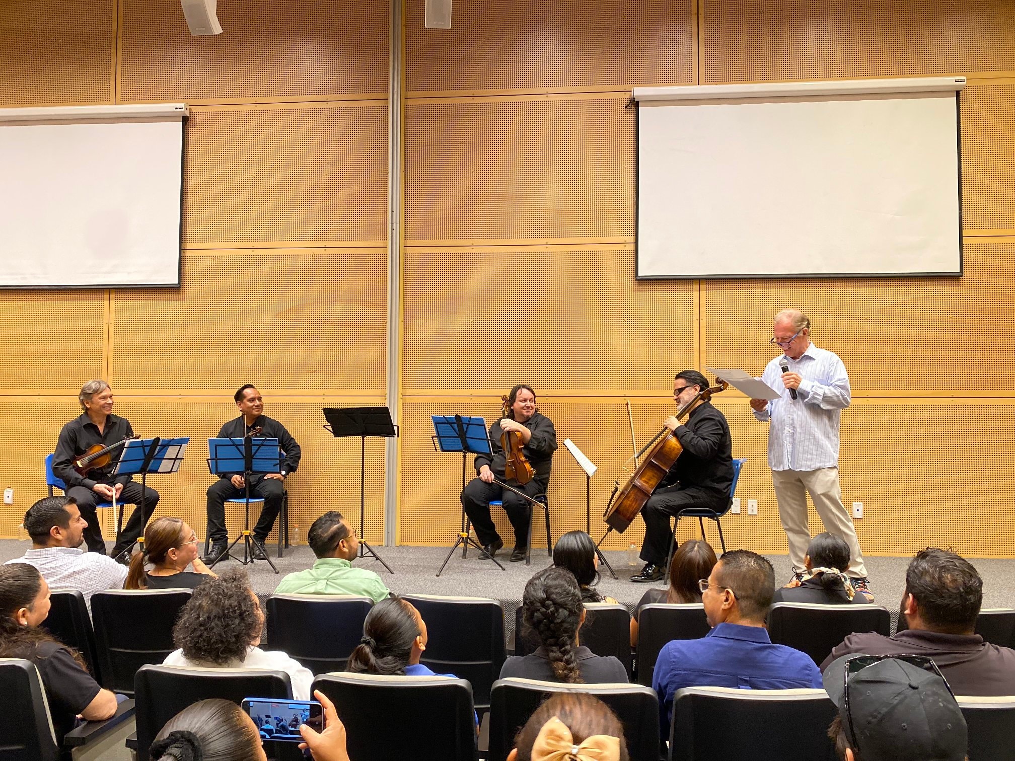 El Cuarteto de Cuerdas de la OFA, integrado por los músicos: Serguey Kossiak (Concertino); Carlos Carmona (Violín); Andreas Toffanin (Viola) y Raymundo García (Violoncello) deleitaron a los asistentes con un grandioso programa que incluyó en el repertorio las obras: “Pequeña Serenata Nocturna” (W.A. Mozart); “Danza húngara” n°5 (J. Brahms); “Truenos y Relámpagos” (J. Strauss ); “Siboney” (E. Lecuona); “Jazz Pizzicato” (L. Anderson); “Por una cabeza” (C. Gardel); “Obertura Mexicana” (M.J. Isaac); “Sobre las olas” (J. Rosas); “Jesusita en Chihuahua” (Q. Mendoza).