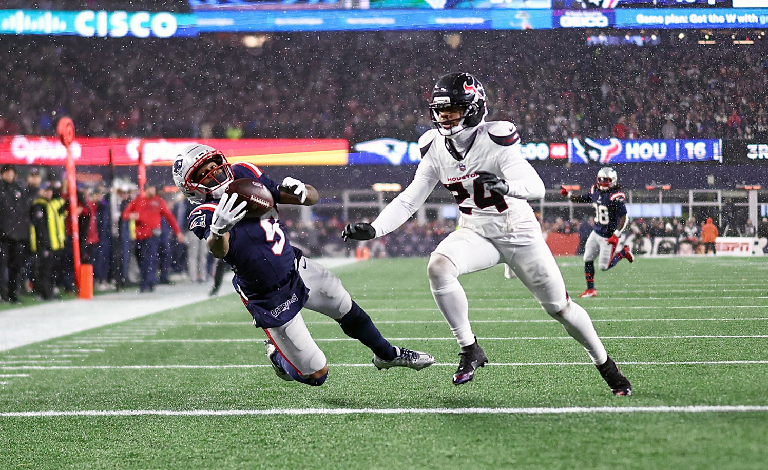 El momento que quebró el partido llegó cuando Houston parecía tener el control. Con ventaja 10-7 y la defensa dictando el ritmo, Stroud lanzó hacia la banda y Marcus Jones leyó la trayectoria. Intercepción y devolución de 26 yardas hasta las diagonales. El marcador se cerró 14-10 y el partido cambió de dueño. Desde ahí, el juego se volvió incómodo para los Texans y familiar para los Patriots.