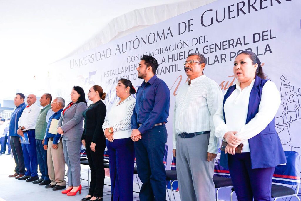 Previo al inicio del acto protocolario, funcionarios de la UAGro colocaron la bandera rojinegra el inicio de la Huelga Estudiantil del movimiento de 1960 que concluiría el 30 de diciembre con la matanza de 19 personas.