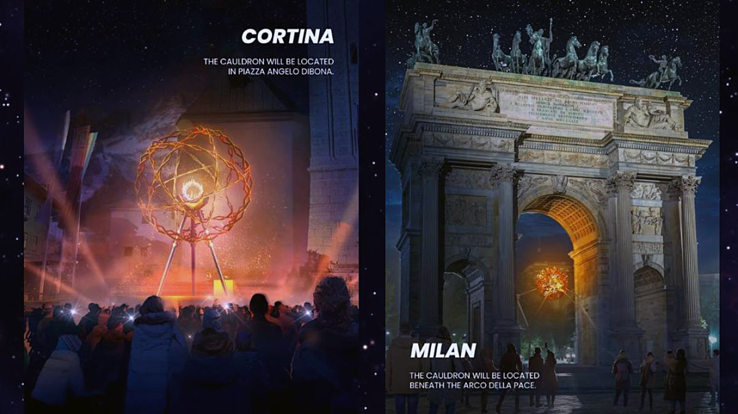 Dichos pebeteros, que presiden dos lugares emblemáticos de sendas ciudades huéspedes, fueron encendidos por los esquiadores Alberto Tomba y Deborah Compagnoni, ambos tres veces campeones olímpicos, en el Arco de la Paz de Milán; y por la también esquiadora Sofia Goggia, campeona olímpica en 2018, en la Plaza Dibona de Cortina d’Ampezzo.