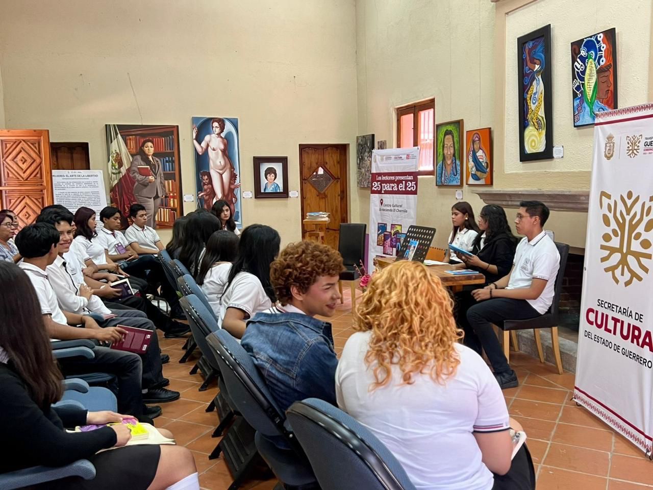En el Centro Cultural Ex Hacienda “El Chorrillo”, de Taxco de Alarcón, se llevó a cabo el círculo de lectura “Los lectores presentan: 25 para el 25”, promovido por el Gobierno del Estado, con la participación de estudiantes de la Preparatoria No. 4 de la Universidad Autónoma de Guerrero (UAGro).