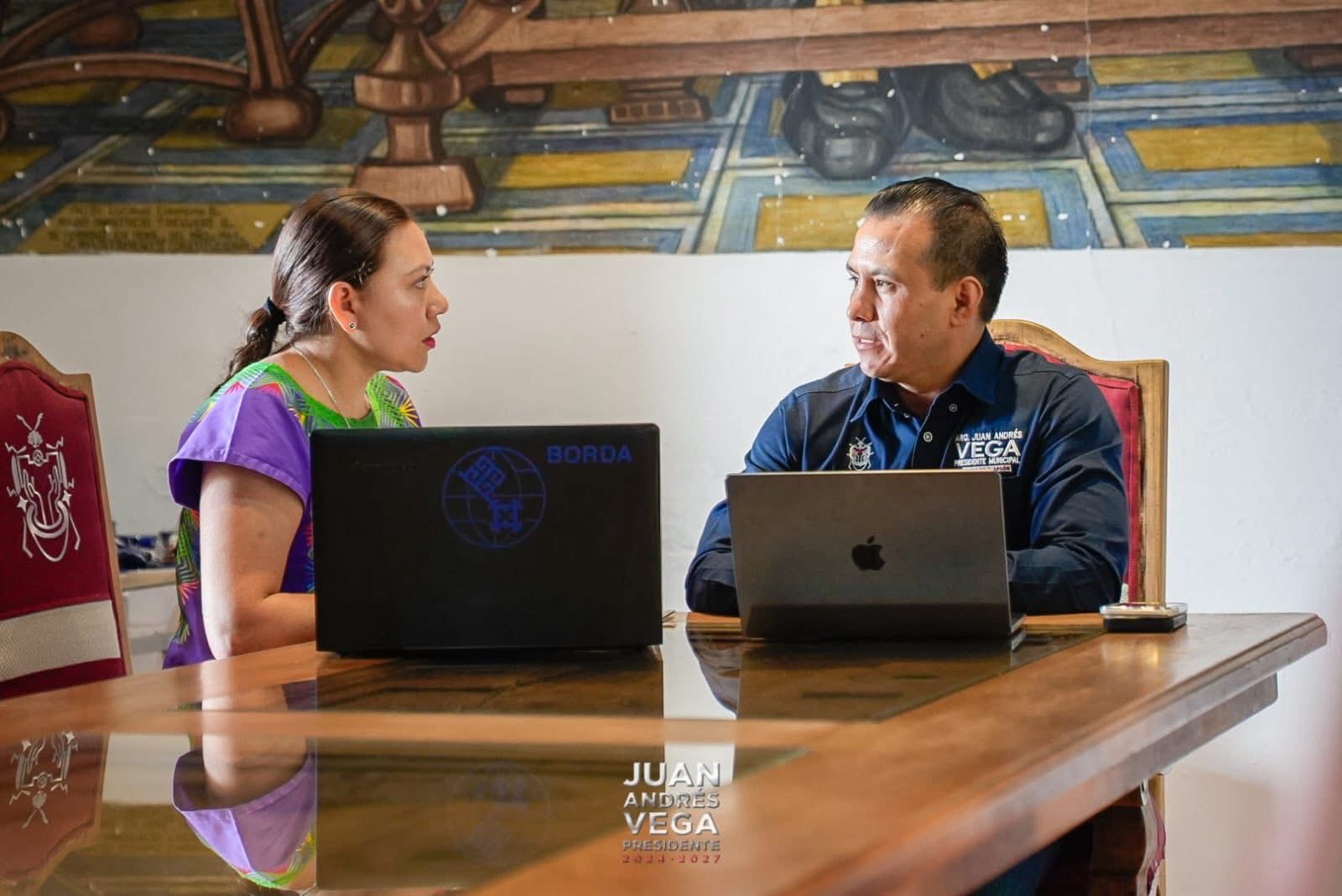Taxco, Gro., Abril 27.- El presidente municipal Arq. Juan Andrés Vega Carranza se reunió con Mayra Ramírez, coordinadora del proyecto MiAgua-SAMIC, para ratificar nuevas obras de agua y saneamiento en comunidades de la cuenca del río San Juan.