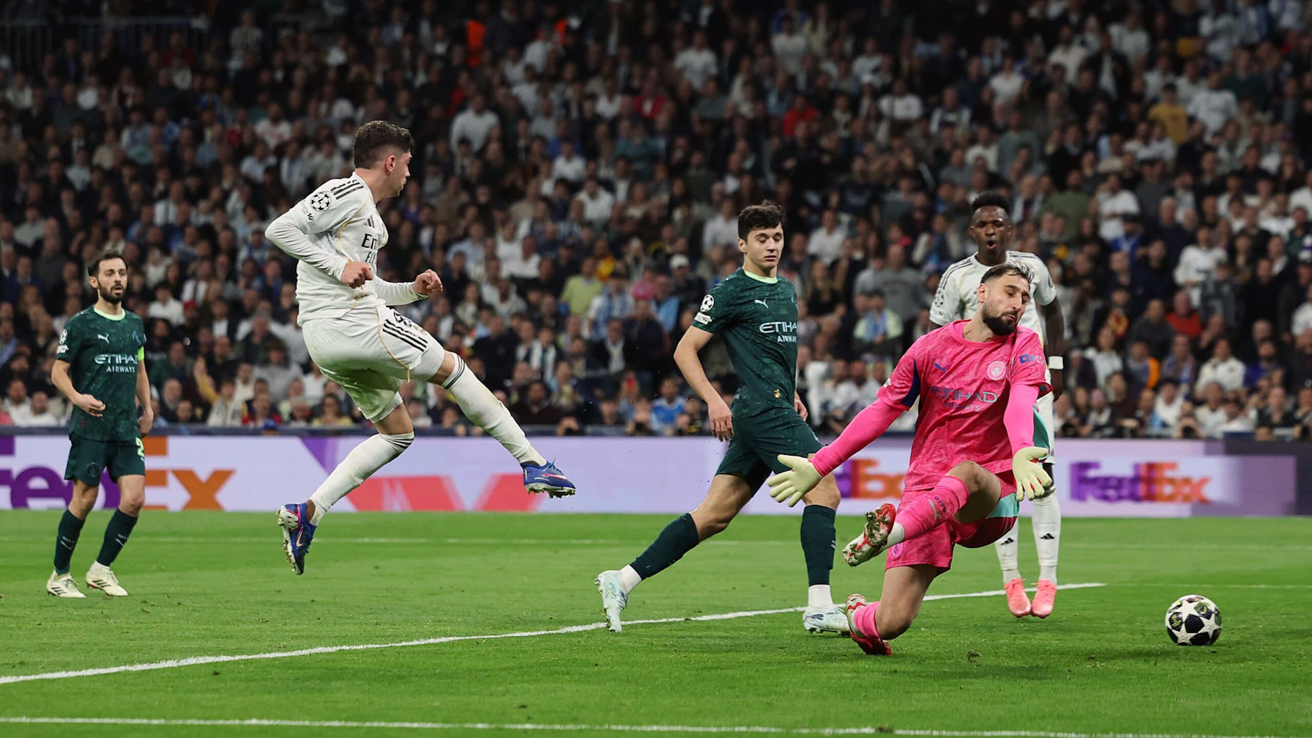 Lejos de conformarse, el Real Madrid olió sangre y fue por más. Siete minutos después, al 27’, nuevamente Federico Valverde apareció en el centro del área para conectar un zurdazo implacable que venció la portería visitante, poniendo el 2-0 en el luminoso. La maquinaria merengue era imparable y el Manchester City no lograba contener las feroces transiciones. Justo antes de ir al descanso, al minuto 42, una brillante asistencia de Brahim Díaz dejó a Valverde en posición inmejorable, y el charrúa no perdonó: sacó un disparo de derecha a quemarropa. Un hat-trick histórico en menos de 45 minutos que liquidó las aspiraciones de los ingleses.