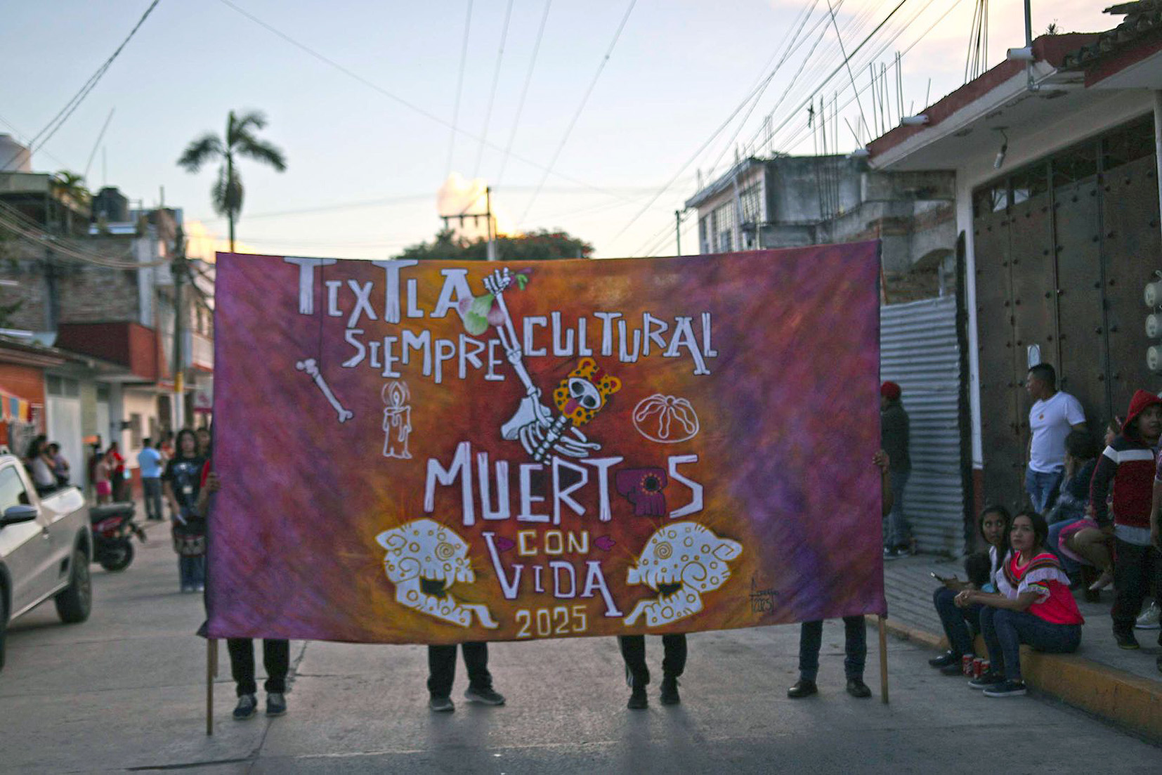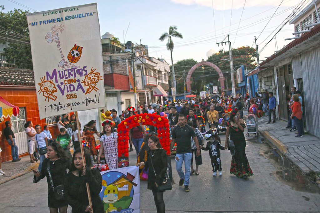 Tixtla, Gro., Como parte del Festival de Día de Muertos, la tarde del sábado se llevó a cabo el tradicional desfile denominado «Muertos con Vida», organizado por el Colectivo 43 Artes, que recorrió las principales calles del centro de Tixtla, saliendo del lienzo charro y culminando en el panteón.