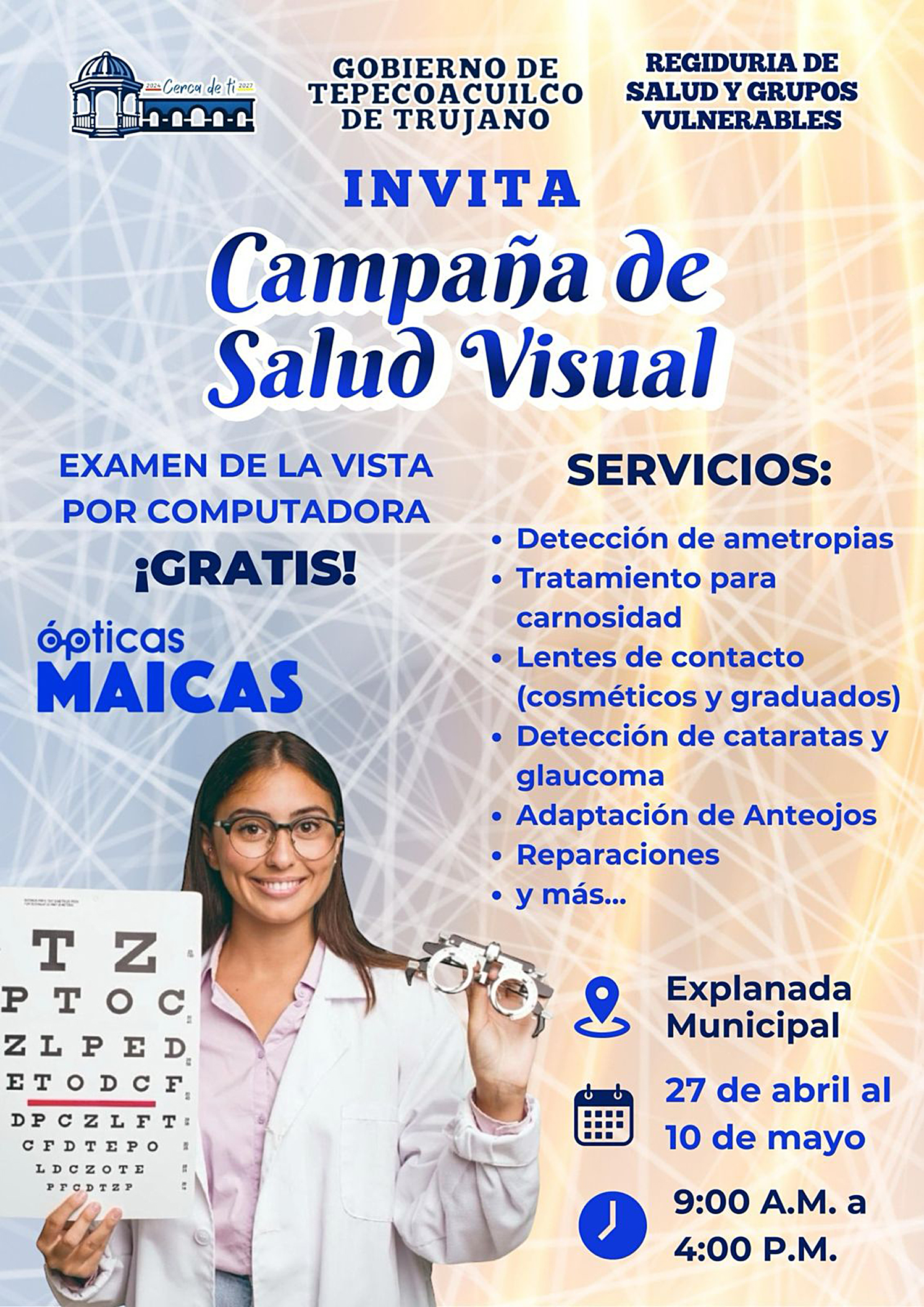 Tepecoacuilco, Gro., El H. Ayuntamiento Municipal de Tepecoauilco, a través de la Regiduría de Salud y Grupos Vulnerables, encabezada por Alejandro Elihú López Ávila, invita a la ciudadanía a participar en la “Campaña de Salud Visual”, que se llevará a cabo del 27 de abril al 10 de mayo en la explanada municipal.