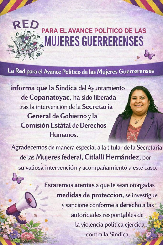 La Red para el Avance Político de las Mujeres Guerrerenses condenó “enérgicamente la privación ilegal de la libertad de la síndica procuradora del Ayuntamiento de Copanatoyac, Florencia Arce Campos”, que ocurrió la mañana de este viernes en el Palacio Municipal de aquella cabecera de la región Montaña, por parte de policías municipales.