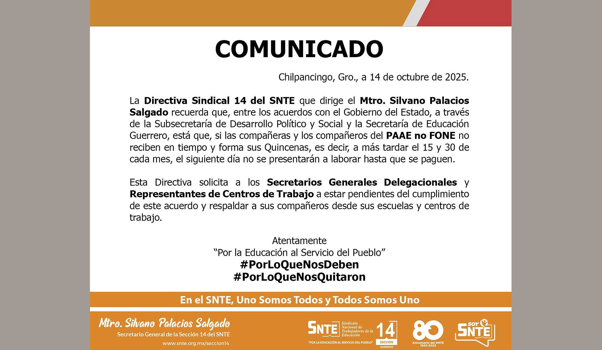Chilpancingo, Gro., La Directiva Sindical de la Sección 14 del SNTE advirtió que podrían salir a las calles a protestar ante el incumplimiento de su pliego petitorio por parte del gobierno estatal.