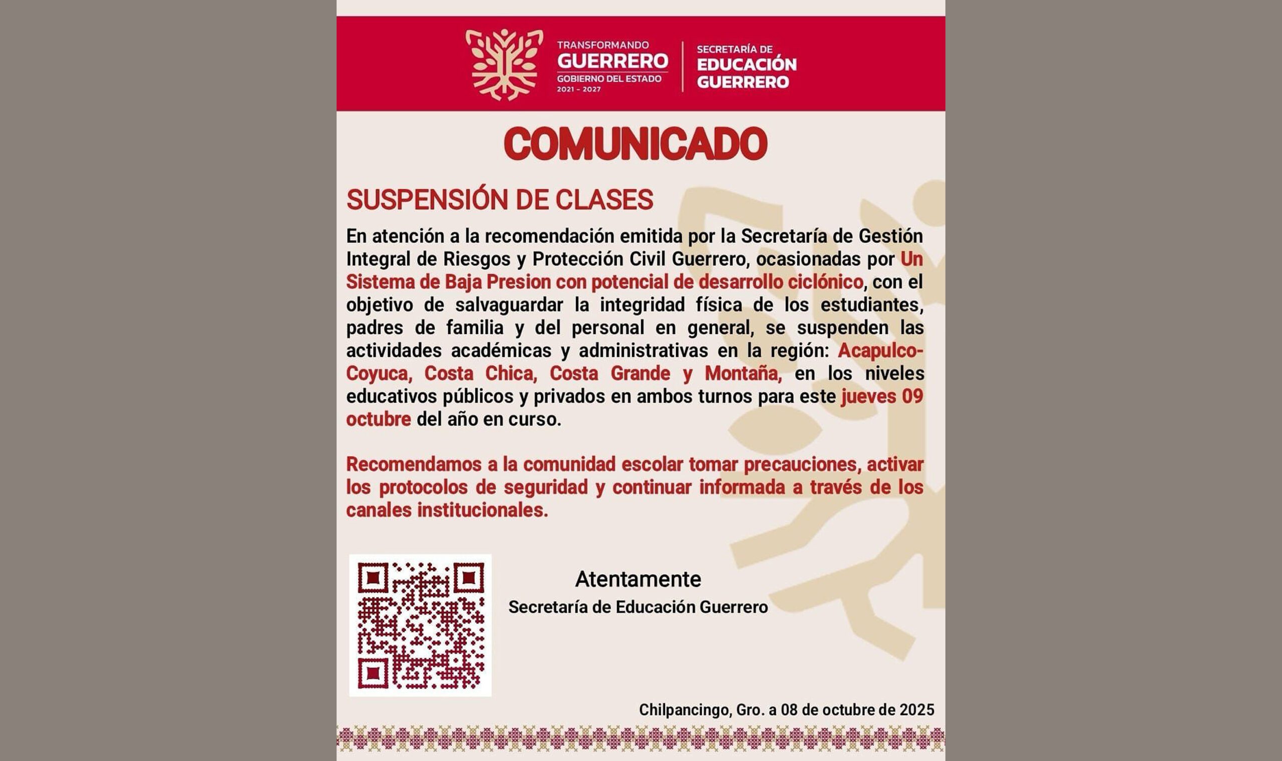 Chilpancingo, Gro., La Secretaría de Educación de Guerrero (SCT) anunció la suspensión de clases para este jueves en todas las escuelas públicas y privadas de todos los niveles y en ambos turnos en las regiones: Acapulco-Coyuca, Costa Chica, Costa Grande y Montaña, en atención a la recomendación de la Secretaría de Gestión Integral de Riesgos y Protección Civil de la entidad, debido a un sistema de baja presión con potencial de desarrollo ciclónico.