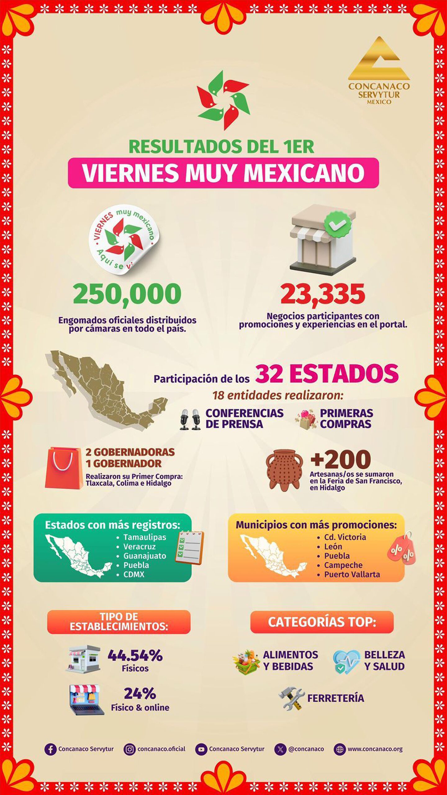 Agregó que, a nivel nacional, se enviaron los resultados de este primer “Viernes muy Mexicano”, el cual se llevará a cabo el último viernes de cada mes, con las mismas ofertas y promociones de los negocios participantes.