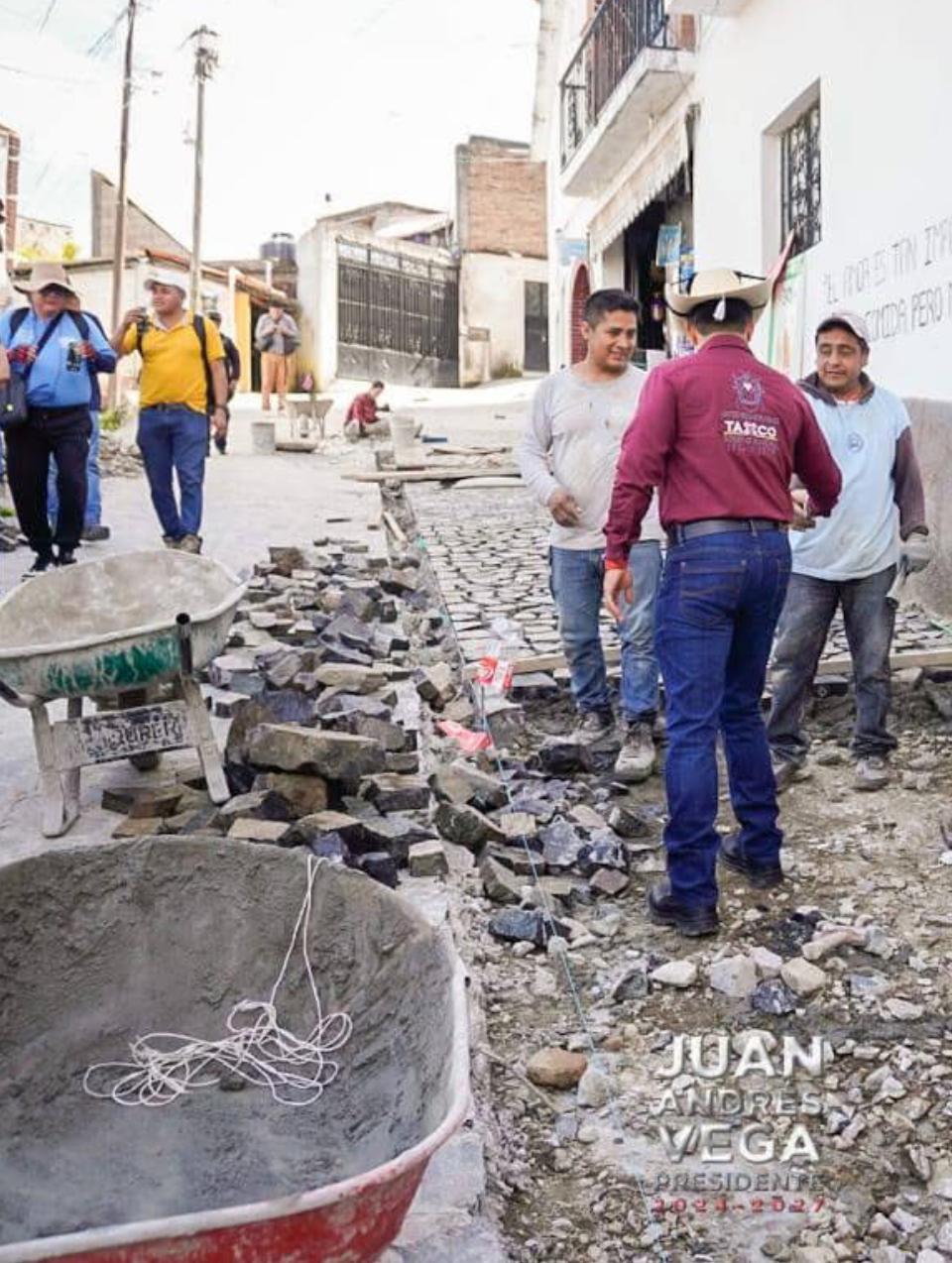 Taxco, Gro., Octubre 4.- El presidente municipal Juan Andrés Vega, supervisó el avances de los trabajos de empedrado y bacheo que se están realizando en la calle 20 de Noviembre, una de las más transitadas que conectan al centro de Taxco.