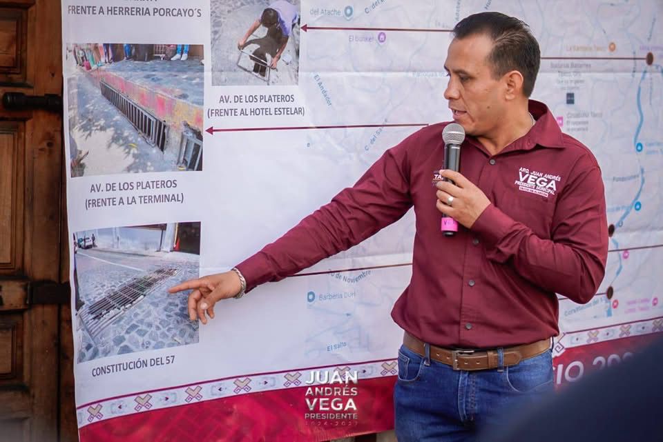 Taxco, Gro., Septiembre 9.- Con el objetivo de garantizar seguridad y funcionalidad en una de las zonas más importantes del centro histórico, el presidente municipal, Arq. Juan Andrés Vega Carranza, supervisó personalmente los trabajos de rehabilitación de rejillas pluviales en la Plazuela de San Juan.