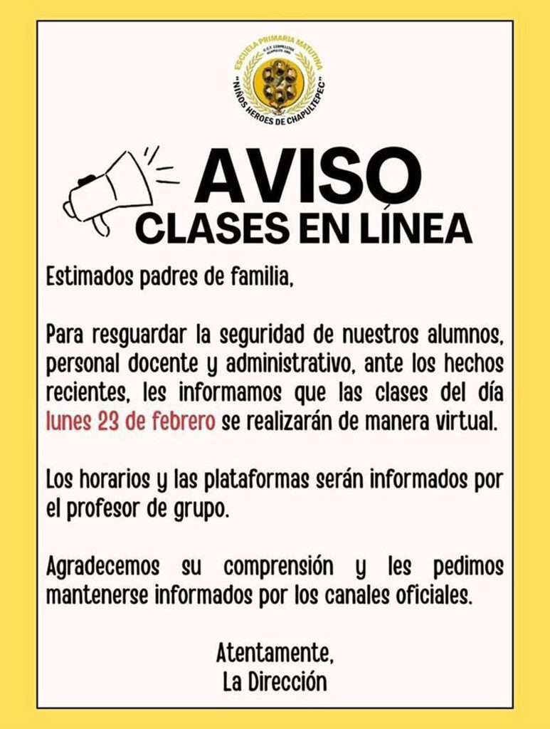 En el ámbito privado, instituciones de nivel básico y medio superior también comunicaron la cancelación de clases. El Colegio Militarizado Madrid informó a su comunidad estudiantil, mediante un comunicado, que la suspensión se determinó para “salvaguardar la integridad de nuestros estudiantes”.