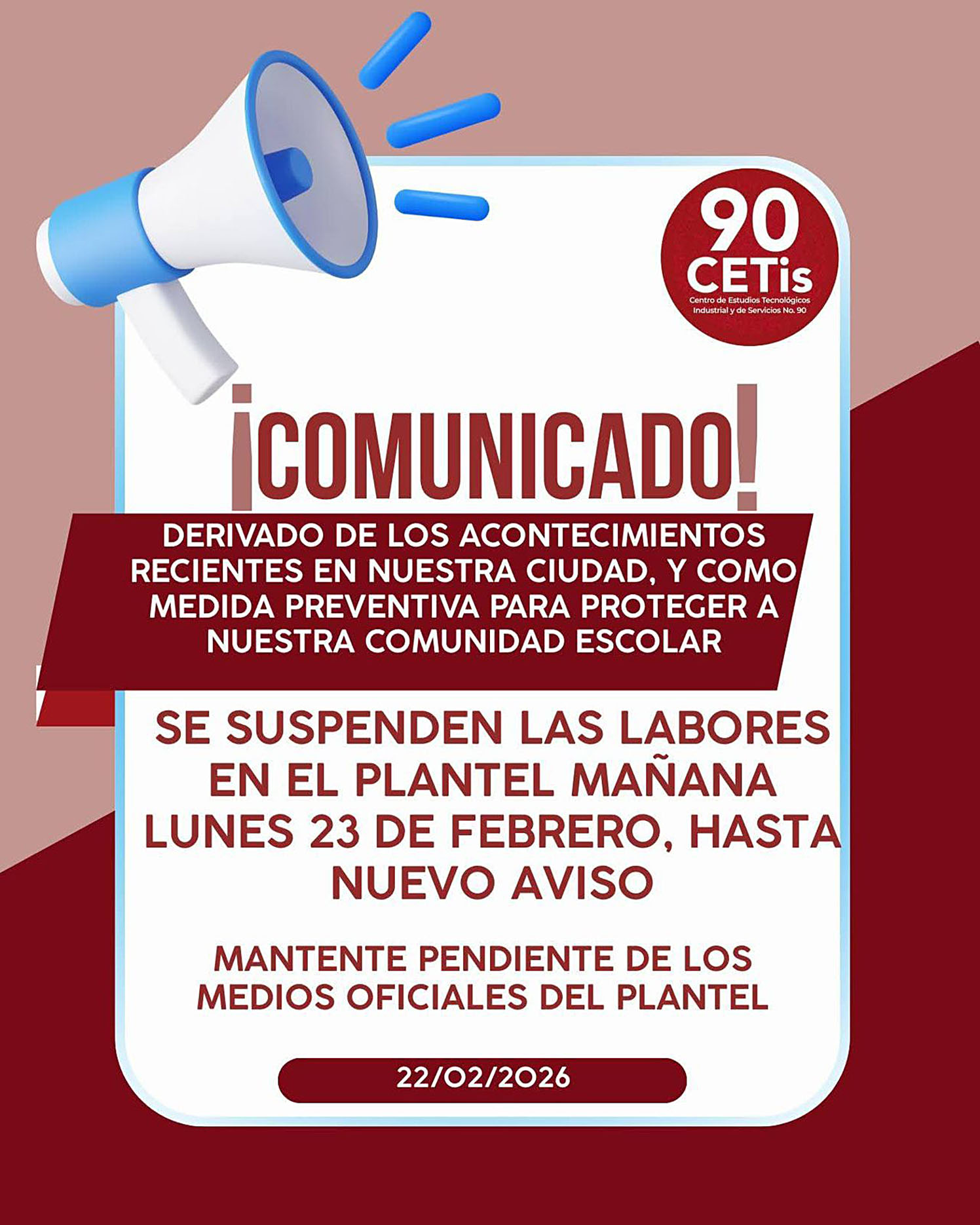 De igual forma, el CETis 90, ubicado en la colonia Las Cruces, notificó a su alumnado a través de redes sociales que se sumaba a la suspensión de actividades académicas para este lunes.