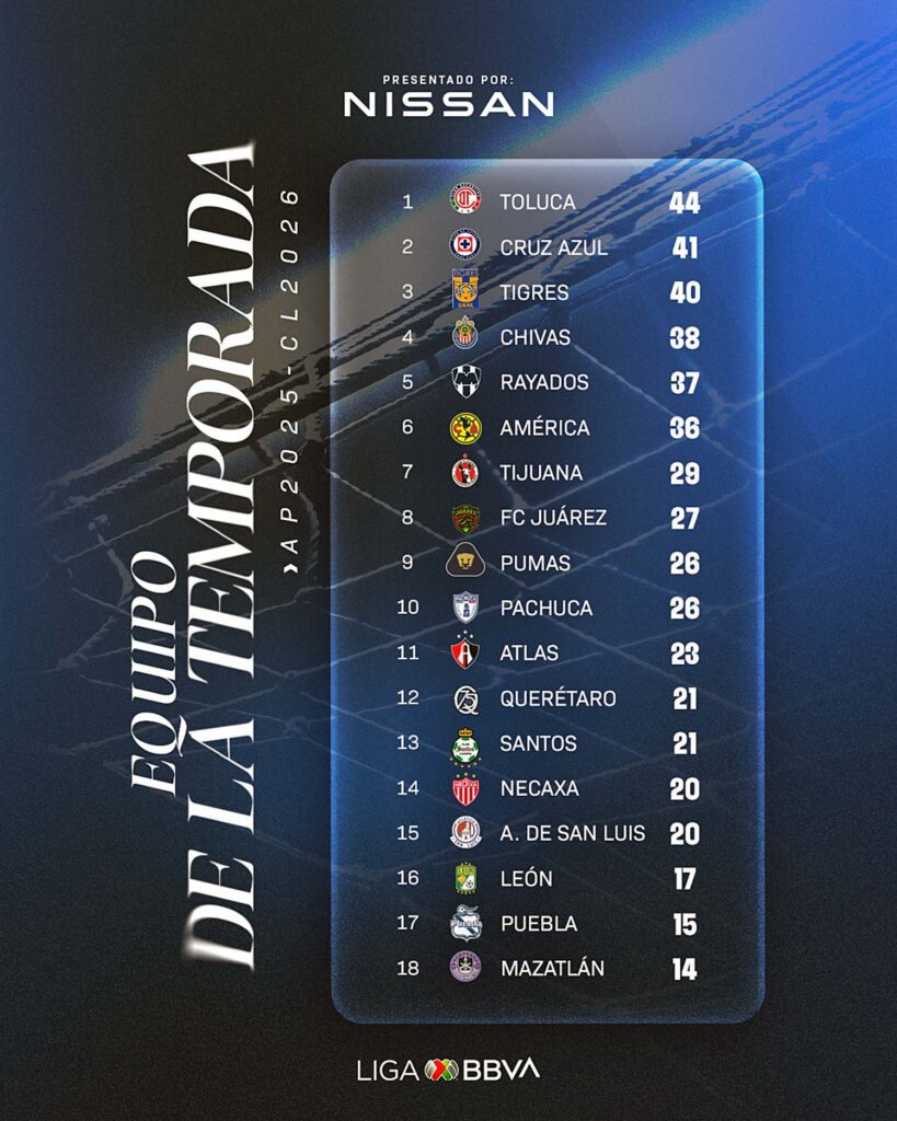 Toluca, que obtuvo el título en el Apertura 2025, marcha como líder, aunque Cruz Azul y Tigres se mantienen cerca, no muy alejados de Chivas, Monterrey y América, que también han mostrado cierta consistencia en lo que va del año.