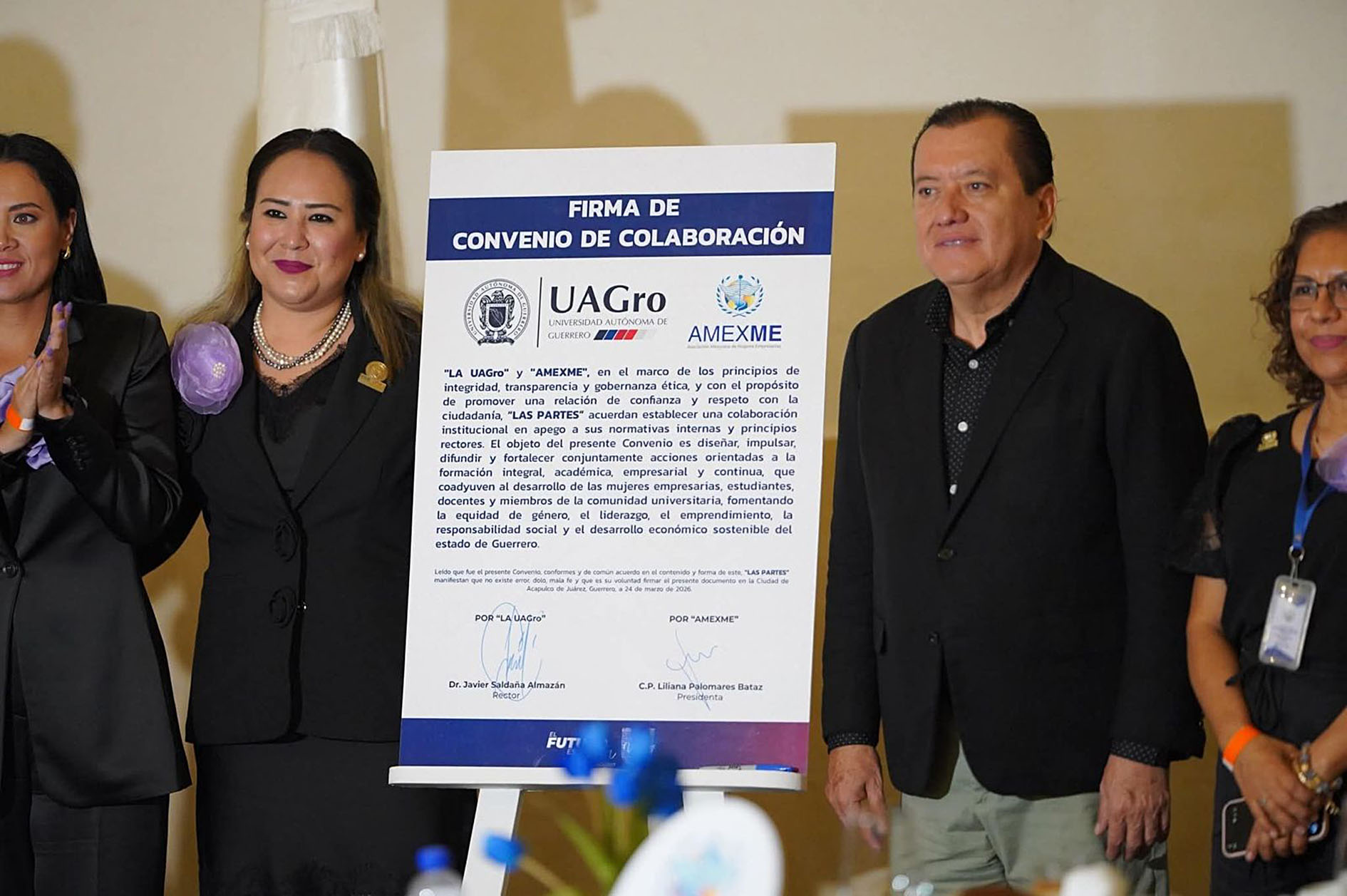 Chilpancingo, Gro., El rector de la Universidad Autónoma de Guerrero, Javier Saldaña Almazán, firmó un convenio de colaboración con la Asociación Mexicana de Mujeres Empresarias (AMEXME), Capítulo Guerrero, con el objetivo de fortalecer el desarrollo profesional y el emprendimiento de las mujeres universitarias.