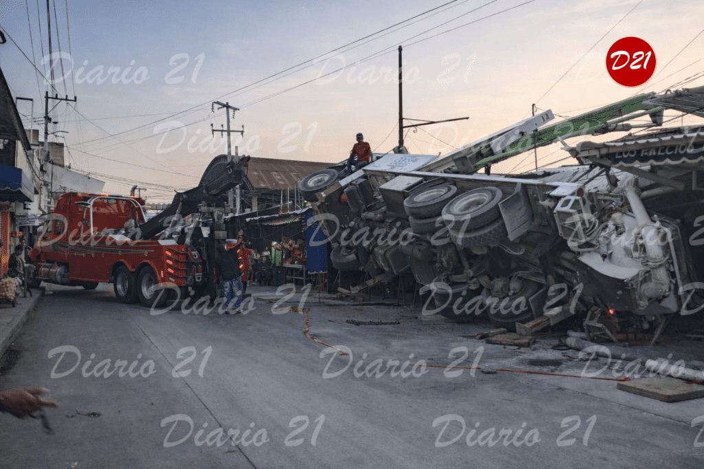 El accidente ocurrió este viernes alrededor de las 4:00 am sobre la calle Galeana esquina con Villa Verde, mientras la unidad vertía la mezcla en la obra que realizan en los locales que recientemente fueron siniestrados.
