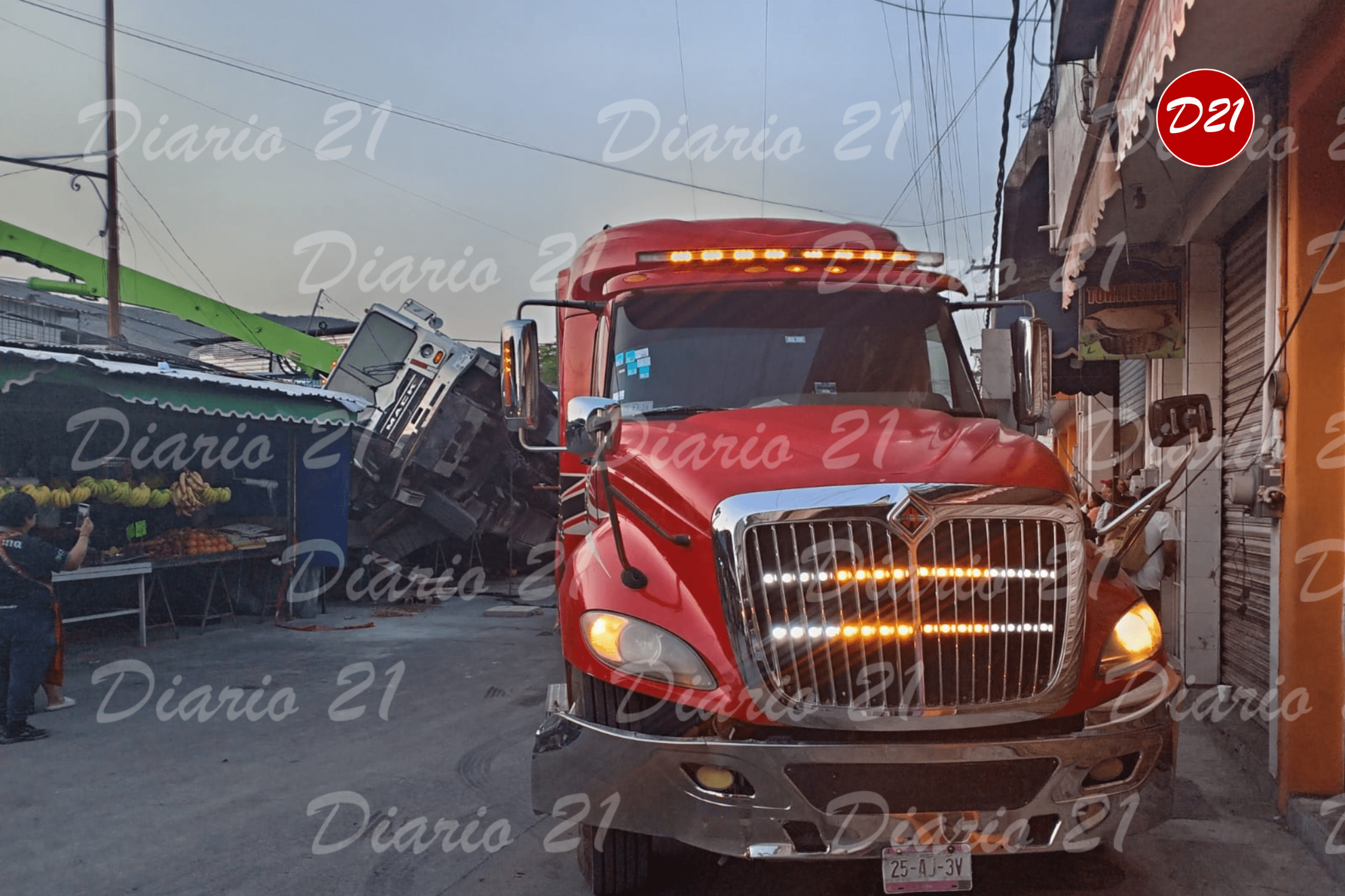 Iguala, Gro., 27/03/2026.- Un pesado camión diseñado para transportar y revolver mezcla de concreto volcó, al parecer por una falla técnica,quedando acostado de su lado derecho, dañando el techado de algunos locales; afortunadamente no hubo lesionados.